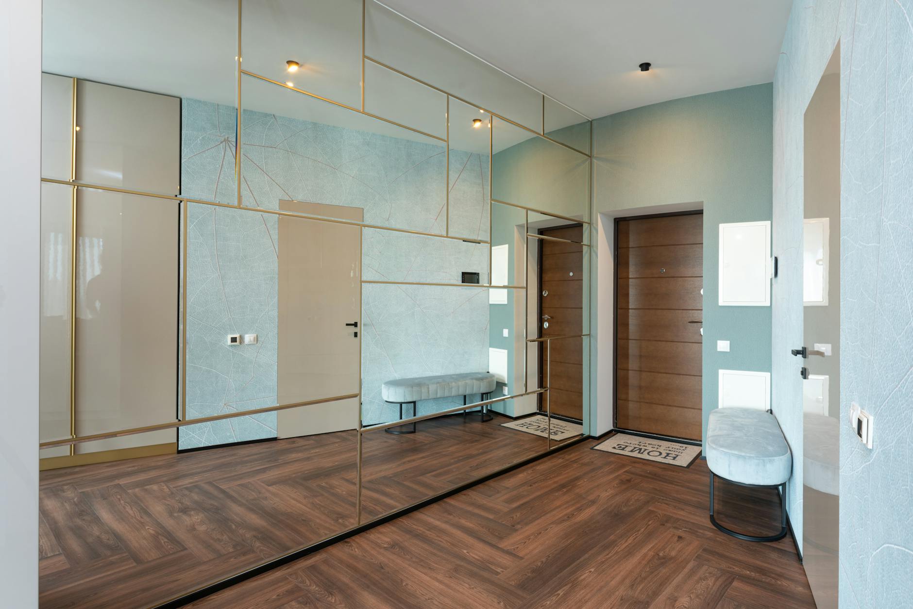 Nowoczesny przedpokój z dużym lustrem i drewnianą zabudową